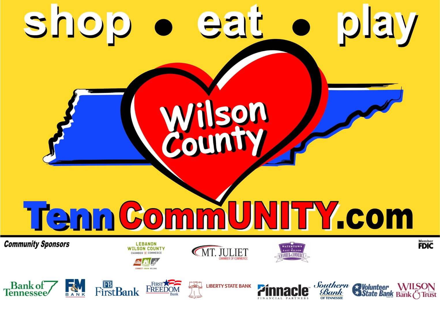 Small businesses are the backbone of Wilson County and as a collection of local communities each with its own identity, we continue to focus on supporting the businesses who make our county unique. TennCommUNITY is an initiative created and designed through the collaboration of several local banks and Chambers, united together with a common goal of supporting the growth of our small business community. It is our hope that by educating Wilson County residents about the importance of investing in our local businesses and promoting the entrepreneurial spirit of its communities, our economy will continue to prosper and enhance the quality of life for its citizens. The people who pour their souls into these local businesses are the ones who make each local community special and as long as their doors remain open, Wilson County will continue to be the best place to live and work. Through this initiative, TennCommUNITY serves as a partner to small businesses, providing advertising and marketing tools, contributed by the network of partnering banks and Chambers. Through the unified efforts of this partnership, we seek to boost commerce and support for Wilson County merchants.